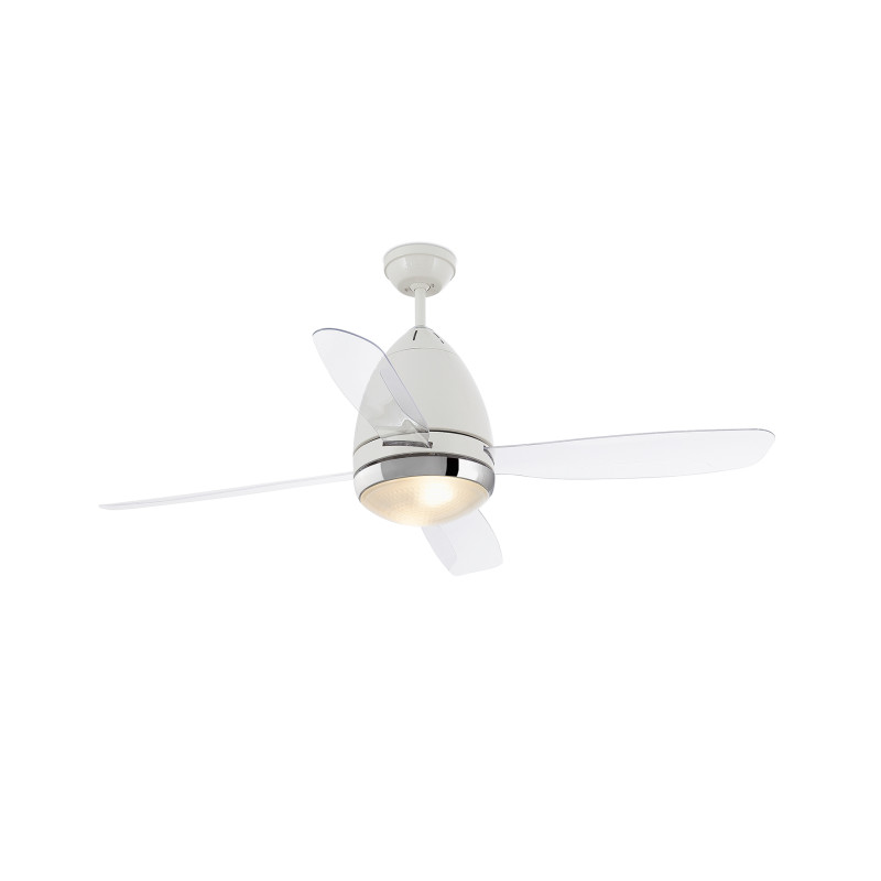 Ceiling fan with light perfect for modern rooms from 13m2 to 17,6m2. Bulb(s) 2X E27 15W not included. We recommend our energy saving bulb ref. 16292 FARO MINI 6U E27 T2 15W 2700K. Motor made from metal and blades from polycarbonnate with a glass difusser. The color of blades are transparent, not reversible . Operated by remote control,( included) setted up with 3 dimmable speeds 90/130/190 rpm which correspond to the following consumptions of 14/25/57w. Thisceiling fan has winter / summer function.