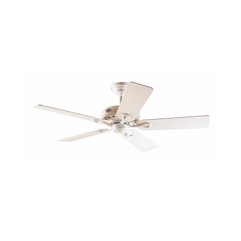 Hunter ceiling fan suitable for rooms from 17,6m2 . Motor made from aluminium and steel and blades from wood . The color of blades are white and beech, reversible. Operated by pull chain, setted up with 1 dimmable speeds MAX. 170 rpm which correspond to the following consumptions of 80w. This ceiling fan has winter / summer function.